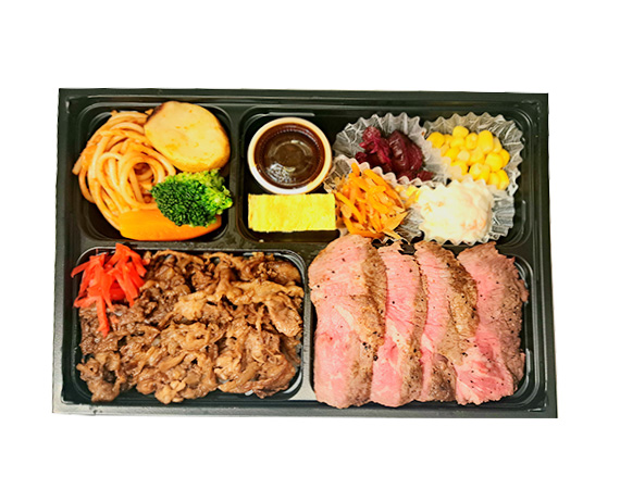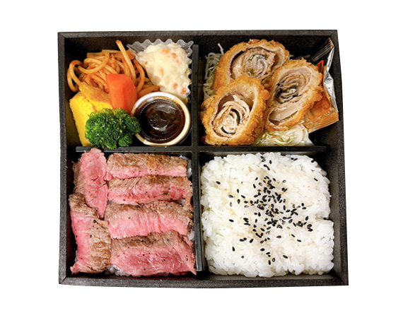 ごはん(180g)、アメリカ産ブラックアンガスビーフステーキ、梅しそロールカツ、ポテトサラダ、など
