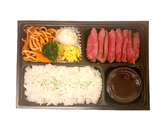 ごはん(90g)、黒毛和牛牛めし(90g)、アメリカ産ブラックアンガスビーフステーキ、ポテトサラダなど