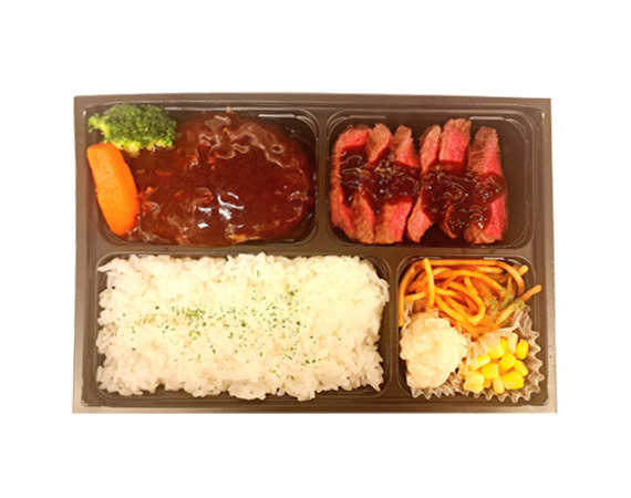 ごはん(180g)、アメリカ産ブラックアンガスビーフステーキ、黒毛和牛黒豚ハンバーグ(デミグラスソース)など