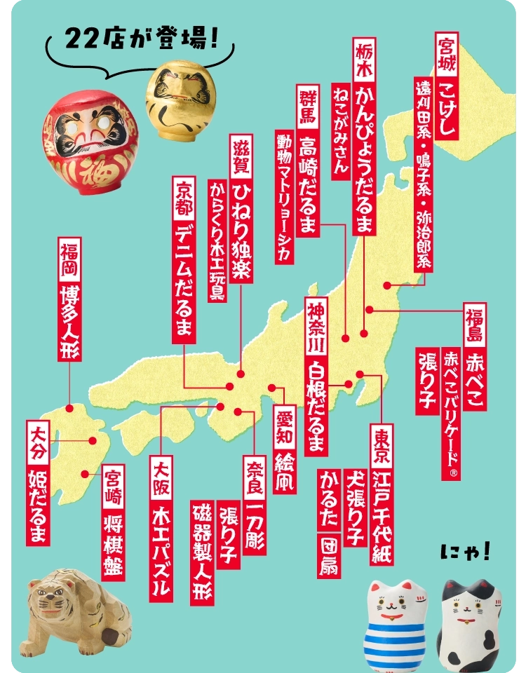 張り子のだるまの約8割を生産している群馬県高崎市から、伝統の高崎だるまをはじめ、デニム使いのモード系やイベントを盛り上げるだるまが大集合!