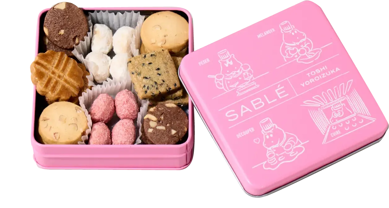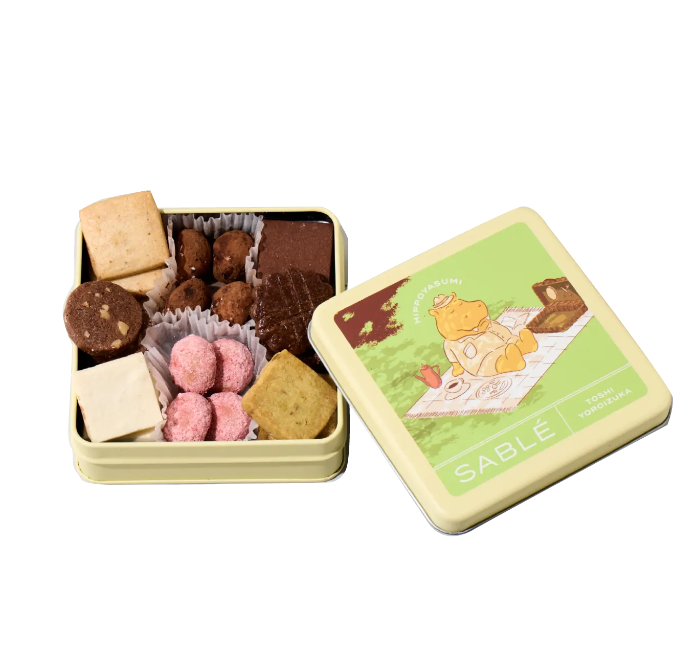 2026年の新作、ショコラをベースにしたクッキー缶。人気のサブレアマンドやブールドネージュショコラ、焼きチョコなど8種類。鎧塚シェフが描く“トシヒポ”とひと休みしませんか。