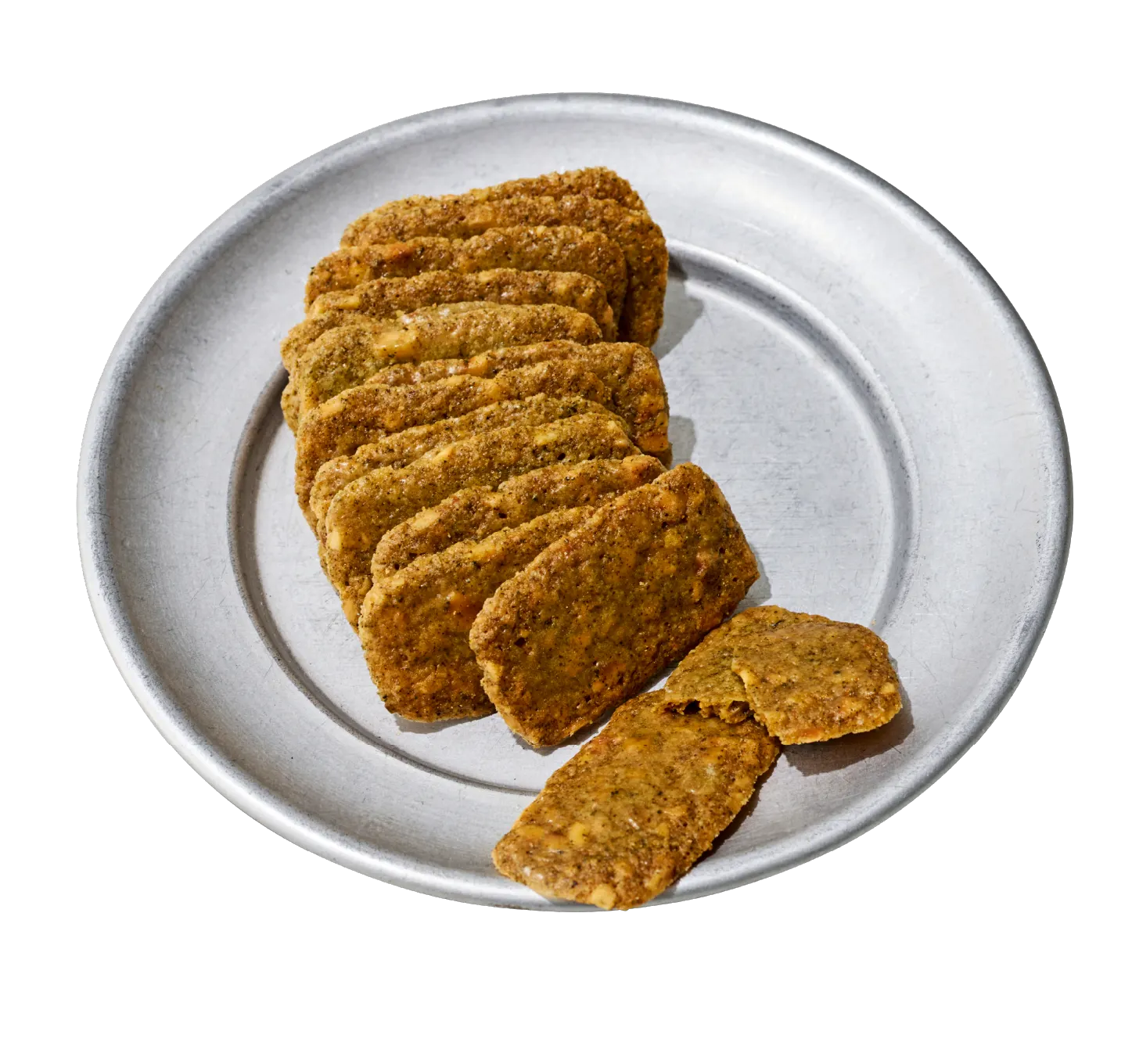 有塩バターをまとわせて乾燥させたバゲットラスクに、カソナードのサブレを表面に絞って焼き上げ。香ばしさとほどける食感が続き、シンプルながら深みと温かみのある味わいに仕上げました。