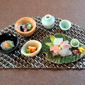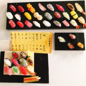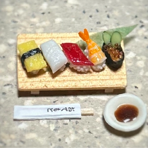 樹脂粘土でシャリ(ごはん)やネタを作ります。醤油小皿、お箸は完成したものをお渡しします。