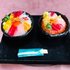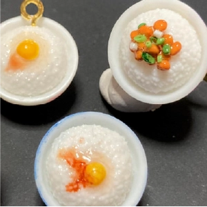 納豆ご飯とたまごかけご飯どちらか1点を制作。粘土で納豆を作ったり、レジンでとろみを表現。キーホルダーや指輪にもできます。
