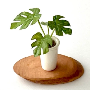 粘土をハサミで葉の形に切り抜き、絵の具で色をつけて茎も取り付けて植木鉢に植え込みます。