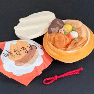 鶏照り焼き・あんず・うずら玉子・きんぴらゴボウ・タケノコ・グリンピースを粘土で制作し、かま飯にデコレーションして完成させます。
