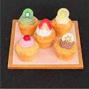 グラシンカップに粘土を入れカップケーキを作ります。焼色の着色後、ホイップクリームとカットフルーツを使いデコレーションして仕上げていただきます。