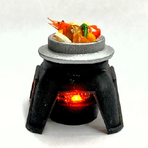 粘土で具材を制作、あらかじめご用意の具材もありますので、組み合わせて、お好みの釜めしを完成させます。旅館などで見かける、あの固形燃料の炎のように見える電気付きです。
