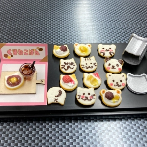 チョコペン仕立て風のお顔を描いたりバター、アイスなどをトッピング。レジンでドリンクを作り、プレートに接着して完成。