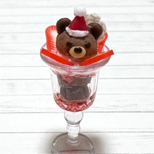 アイスのくまを作り、グラスにいちごやホイップクリームでデコレーションをしてパフェを完成させます。