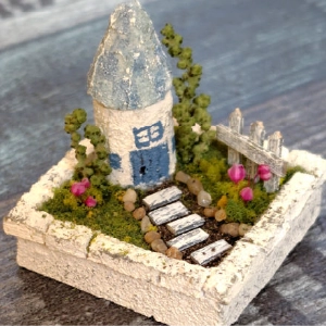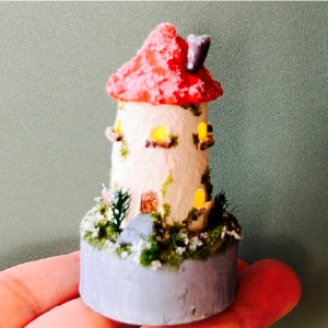 LED照明土台にお好きなカラーを着色した屋根やその他パーツをアレンジして接着、最後に雪を付けて完成させます。
