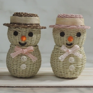 オリジナルの型に合わせて紙巻ワイヤーでスノーマンの頭と帽子部分を編み、リボンやボタンなどパーツを付けて完成させます。時間内に完成するように、胴体部分はあらかじめ編んだものを配布します。