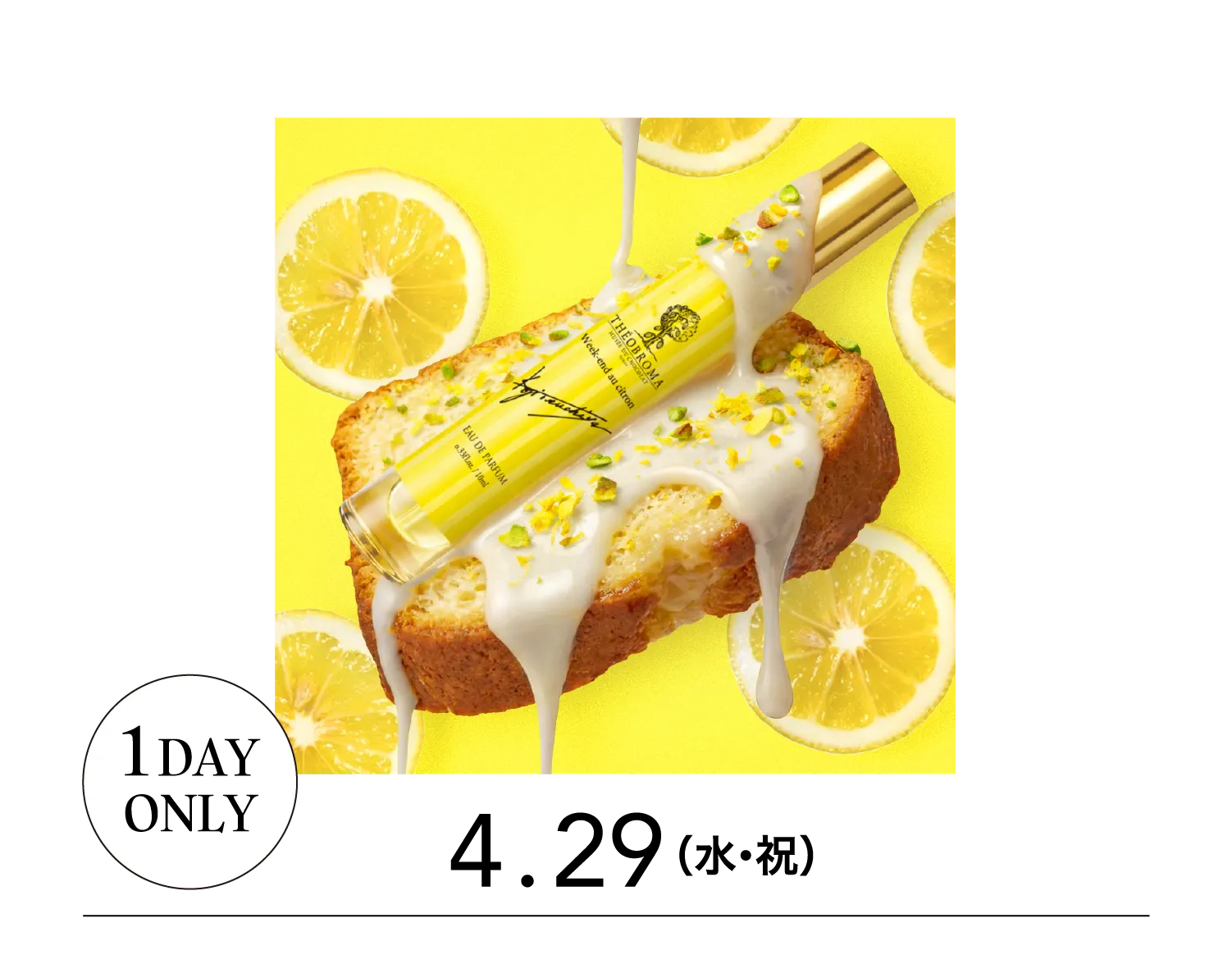 フレグランス マジシャン中田真由美が手がける「テオブロマ パルファン」に、焼き菓子をイメージした香りがイベント限定で登場。削りたてのレモンの皮に、溶けたバターと小麦の香ばしさが重なり、オーブンを開けたかのような芳香。仕上げのアイシングが甘く寄り添うハーモニーを楽しんで。