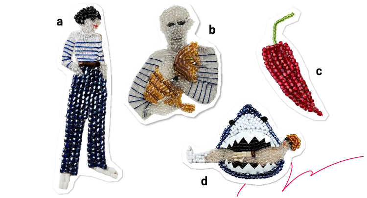 音楽やアートなどの人物像を表現したビーズ刺繍のアクセサリー。バスク名産のエスペレットも。