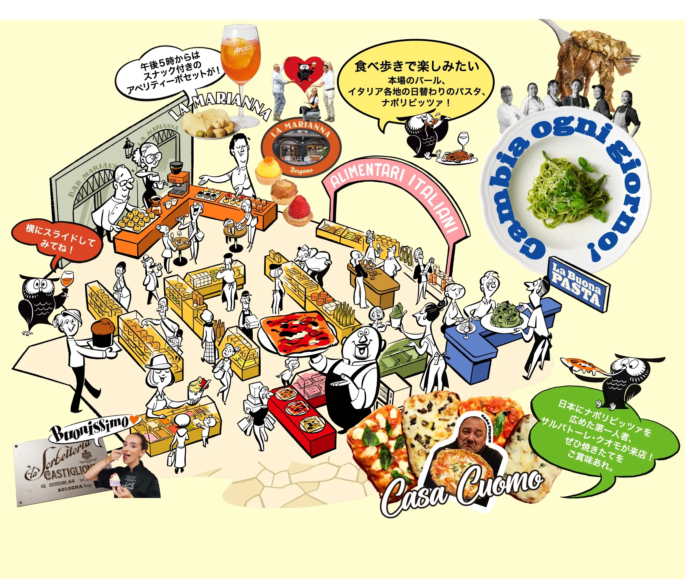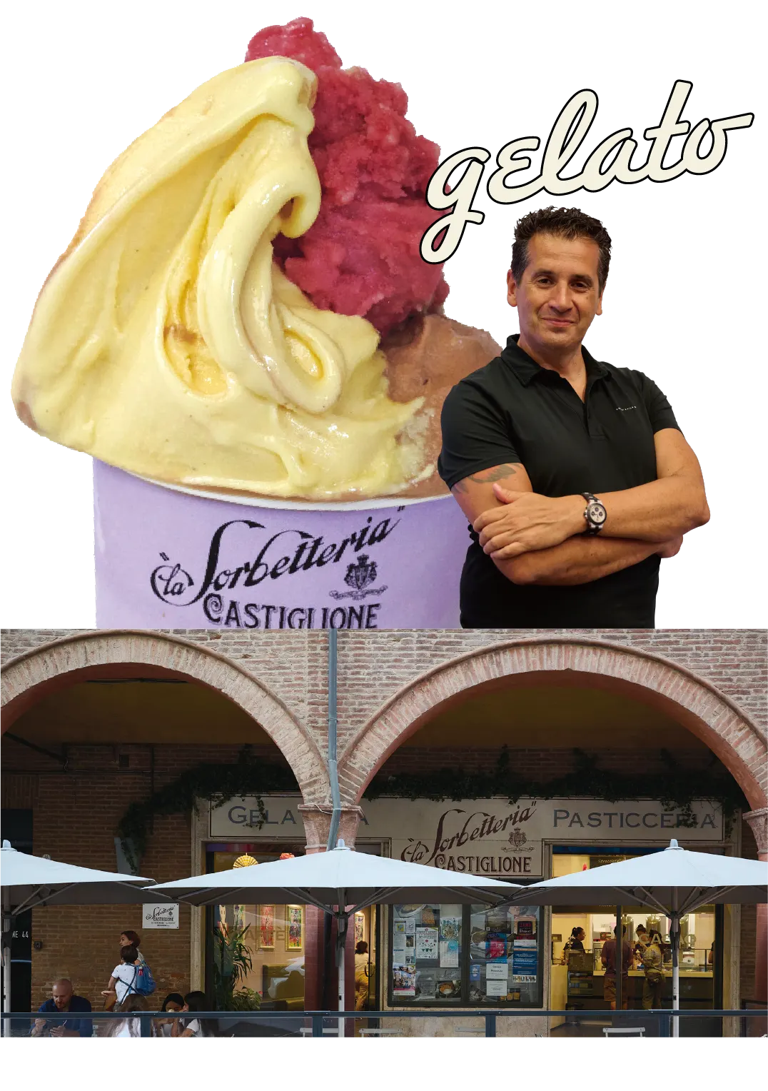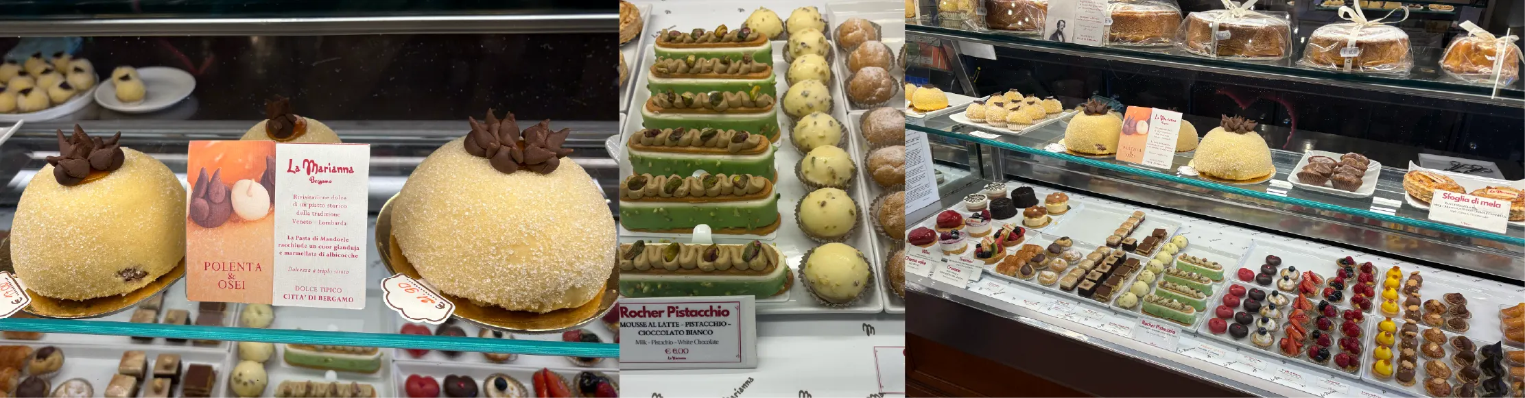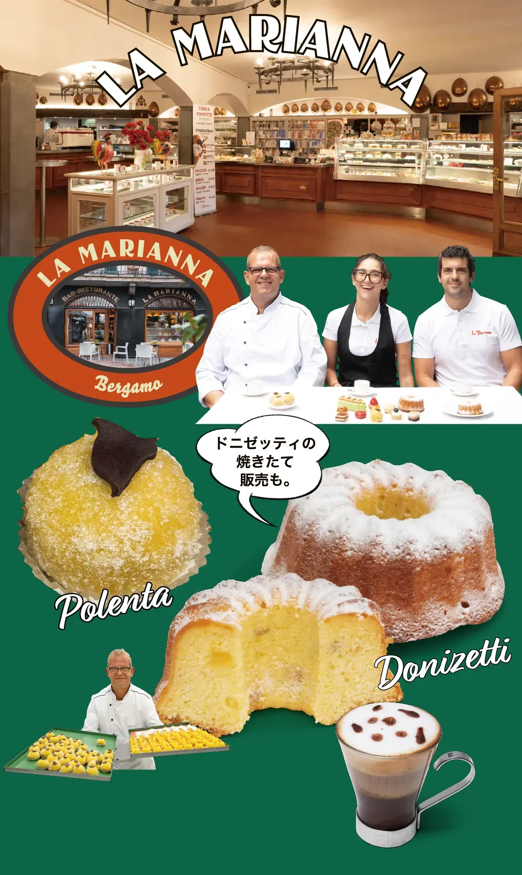 地元の人々から観光客まで、毎日多くの人で賑わうパスティッチェリアバール。この地の伝統菓子ポレンタ・エ・オゼイやベルガモ生まれのオペラ作曲家、ガエターノ・ドニゼッティの名前がついたパイナップルケーキなど、作りたてのドルチェを本場バリスタの淹れたカフェと楽しんで。