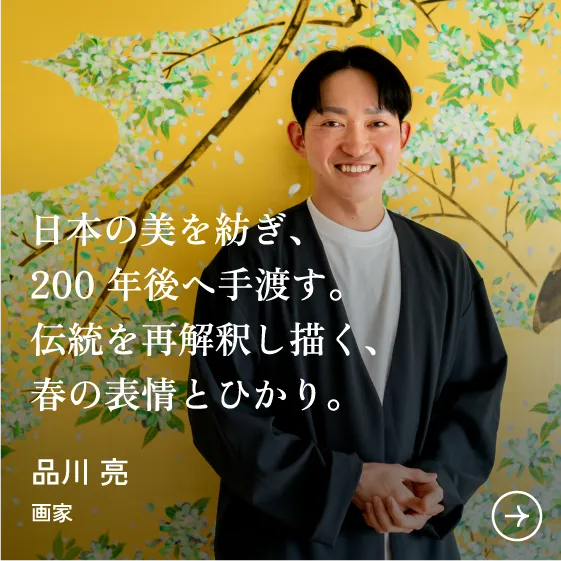 「Japan and me.」のために描き下ろされた、画家 品川亮の作品“春”。作品に宿る春の気配、柔らかな空気感、そして重層的な質感を凝縮したケーキが期間限定で登場。コラボレーション限定のかけ紙がついた特別なギフトボックス入り、“手に取り味わうアソート”をご堪能ください。
