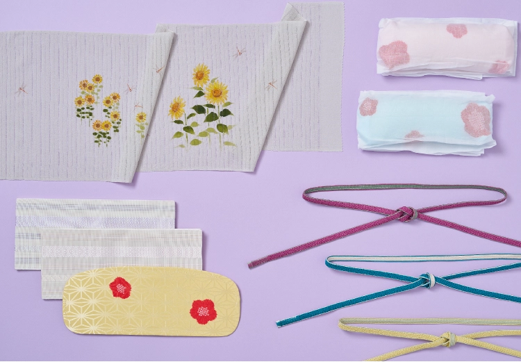右:夏塩沢着尺〈矢羽根〉385,000円、夏織帯〈向日葵(ひまわり)文〉308,000円、オリジナル帯揚げ〈飴色〉19,800円、細冠組帯締め〈濃茶×白〉16,500円
