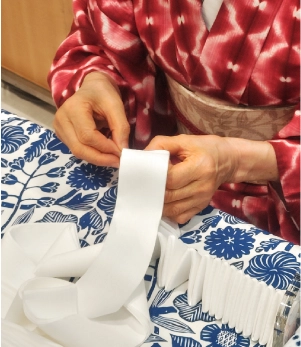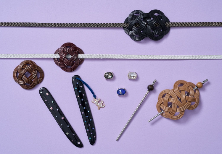 左:インド綿麻着尺〈蛇の目〉171,600円、夏織帯〈あまやどり〉286,000円、オリジナル帯揚げ〈紅藤鼡(ねず)〉19,800円、細冠組帯締め〈水色×白〉16,500円