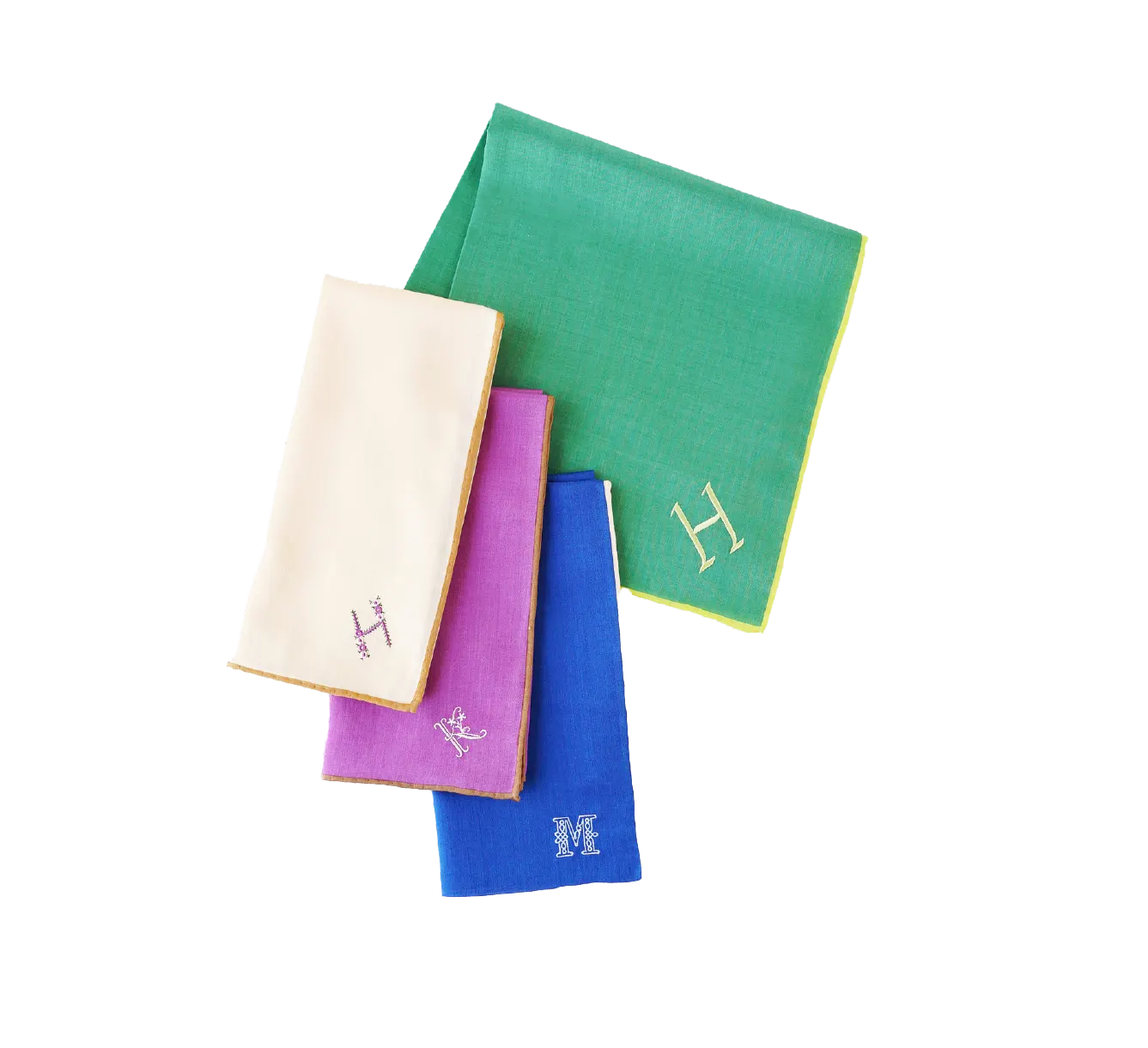 好きなハンカチを選んだら、イニシャルを刺繍して特別な1枚に。イニシャルのデザインは33種類から選ぶことができ、糸の色や入れる位置によっても表情が変わります。