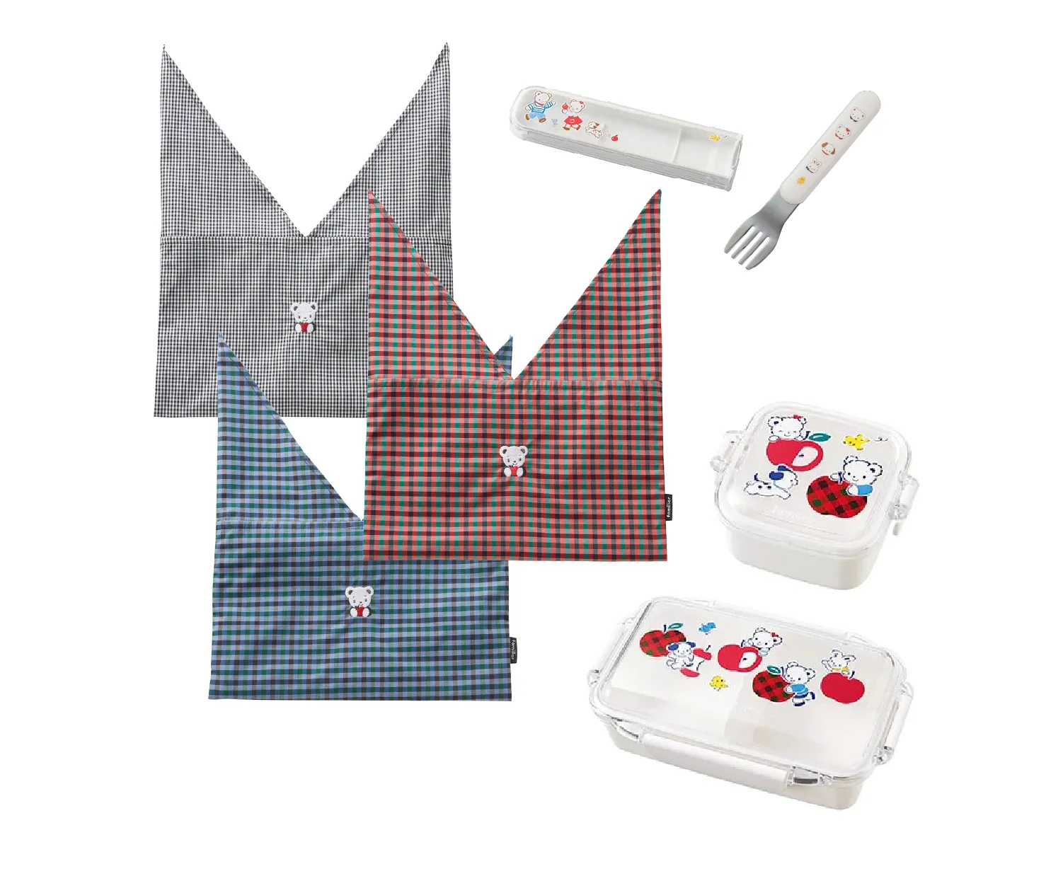 ランチ巾着 各5,500円、ランチボックス 1,980円、カトラリーケース 495円、フォーク 550円、