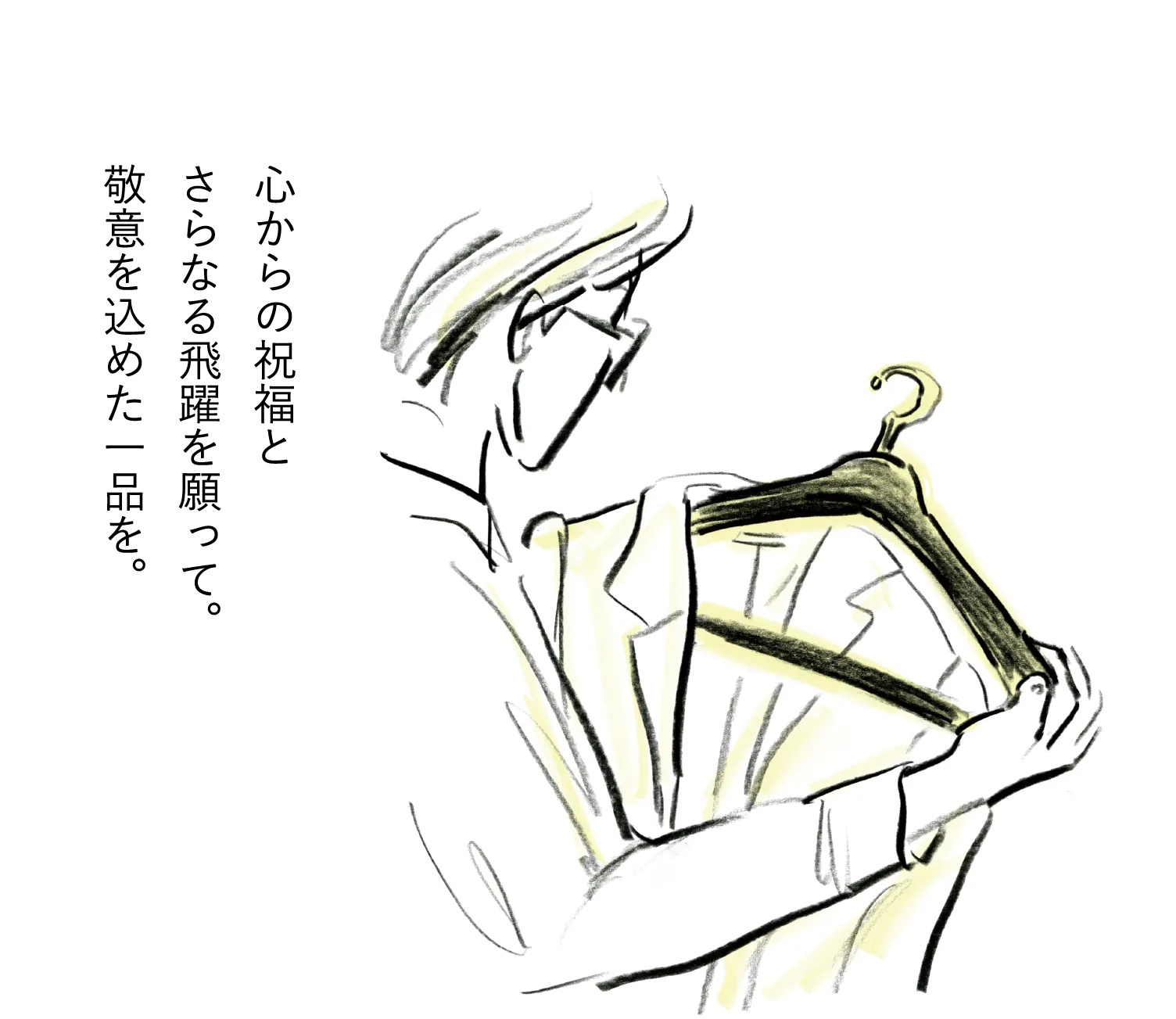 “洋服を大切に扱う人は仕事も丁寧”という私自身の思いから、つい後回しになりがちな上質なハンガーをご提案します。“服をかける”と“福がかかる”を掛けた語呂合わせで、輝かしい未来の幸運を祈るエールを込めました。見えない部分の準備を大事にする大人のたしなみ、新たなステージへ進む方へのお祝いにいかがですか。