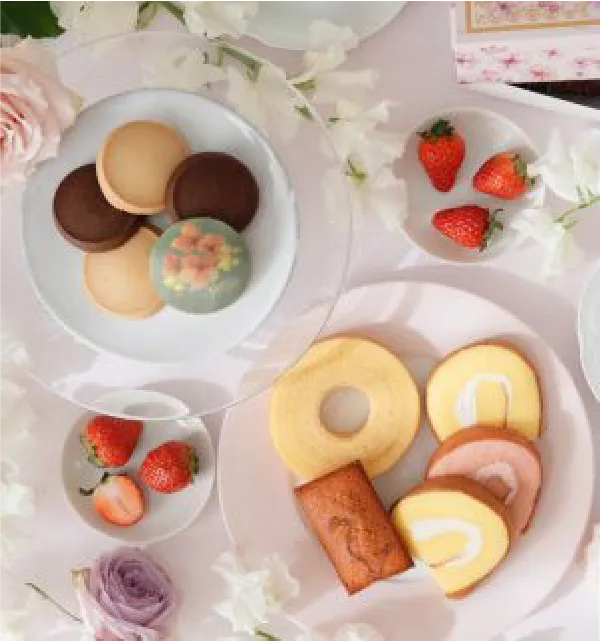 箱を開ければ広がるお花畑。代表作“チューリップローズ”や香ばしいサブレなど、華やかなスイーツの共演。お気に入りの紅茶と共に、至福のひと時を。