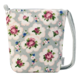 バラや小花のブーケをちりばめた彩り豊かなデザイン。身体に沿いやすい薄型のショルダーバッグで、