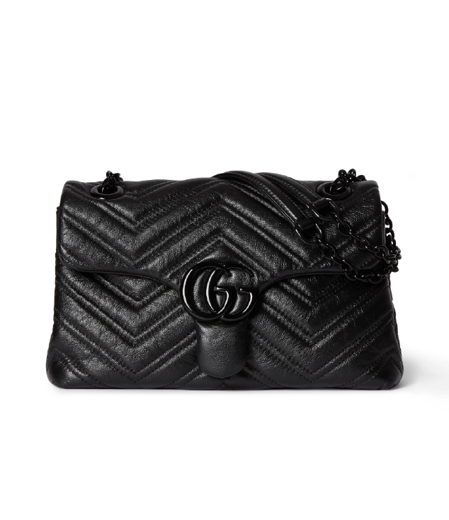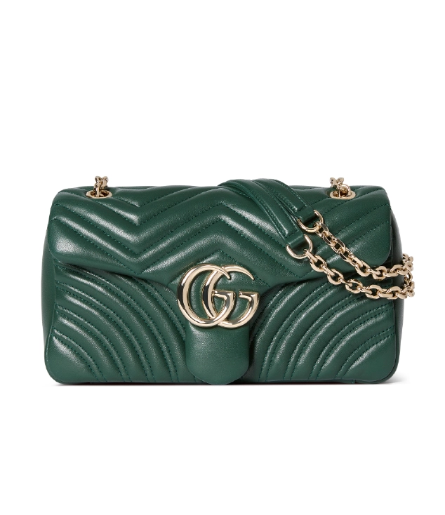 今までとは異なるカラーとマテリアルで装いを新たに生まれ変わった“GGマーモント”ラインの新作バッグ。華やかなゴールドのチェーンとキルティングのレザーがポイントです。