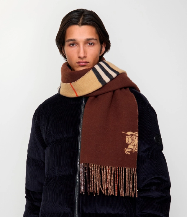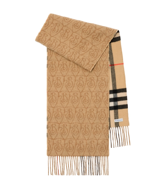 ダブルフェイスのカシミヤスカーフ。スコットランドにある創業200年の紡績工場で製作しました。バーバリーチェックと“馬上の騎士”デザインにインスパイアされたジャカード織Bシールドによるリバーシブルデザインです。