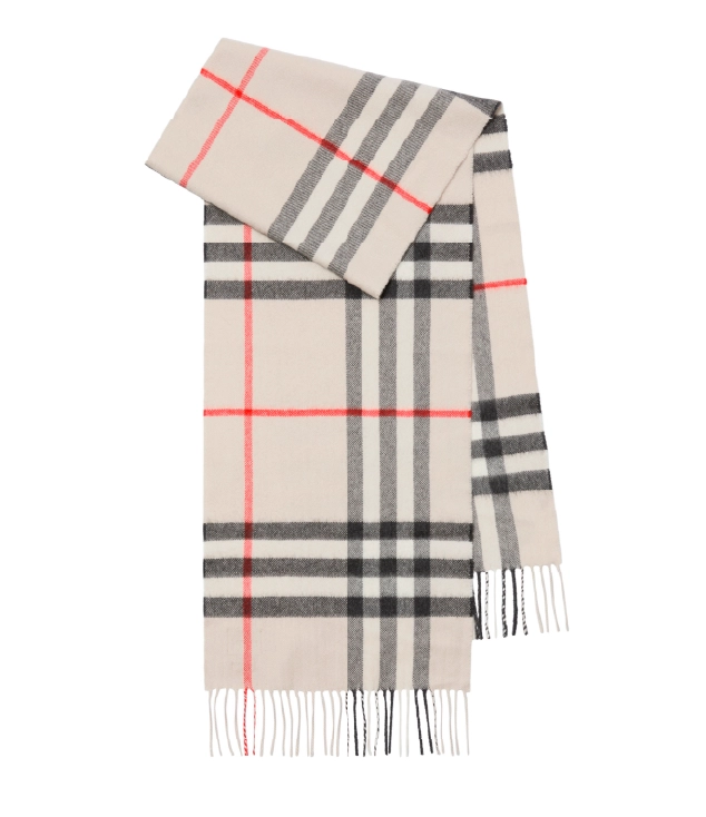 アイコニックなバーバリーチェックを配したカシミヤスカーフ。スコットランドに位置する1797年創業の紡績工場で製作しました。伝統的な織機を使い、30の工程をたどってスカーフを織布。地元の天然水で洗浄し、チーゼルと呼ばれる植物のドライフラワーでカシミヤの表面をかくことで生地を起毛させ、自然な光沢と頬ずりしたくなるような柔らかさに。