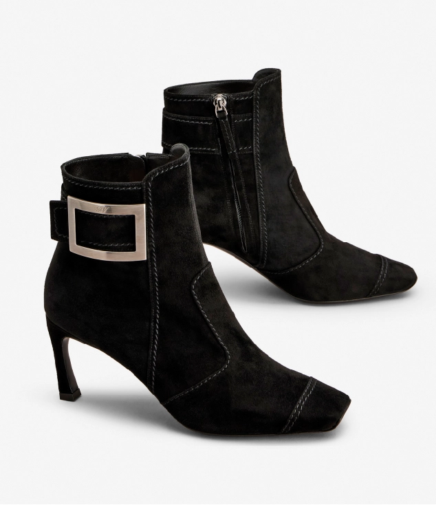トレンチコートから着想を得たステッチと、アイコニックなバックルが存在感を放つアンクルブーツ。フレアなカーブを描くトランペットヒールが大人の魅力を際立たせます。