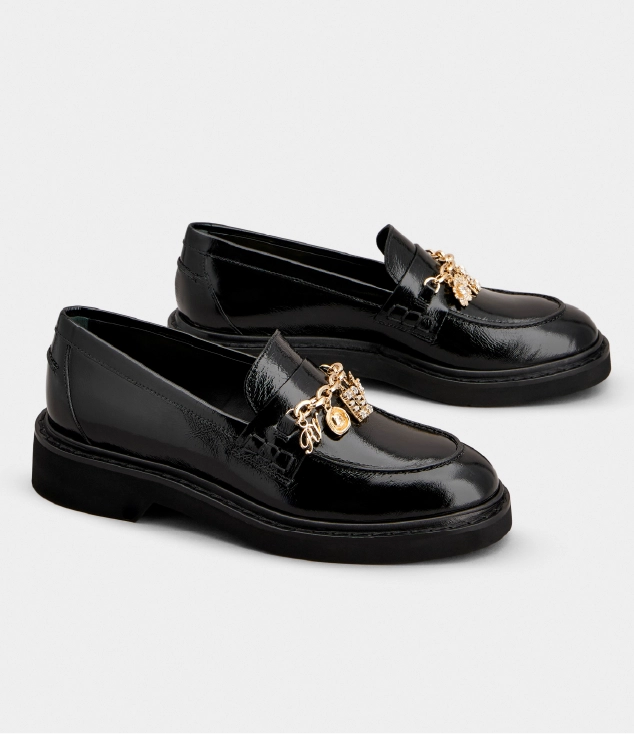 艶やかなパテントレザーに、メゾンのシグネチャーモチーフのチャームを飾った遊び心あふれるローファー。