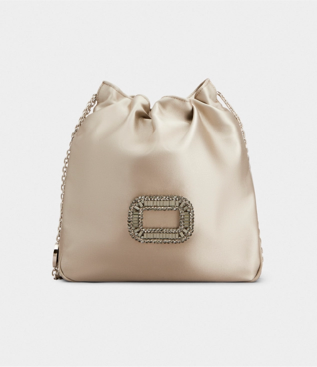 バゲットシェイプのストラスがまばゆい輝きを放つ、アイコニックなピルグリム バックルを飾ったサテンのミニバッグ。様々なシーンでエレガントなムードを演出します。