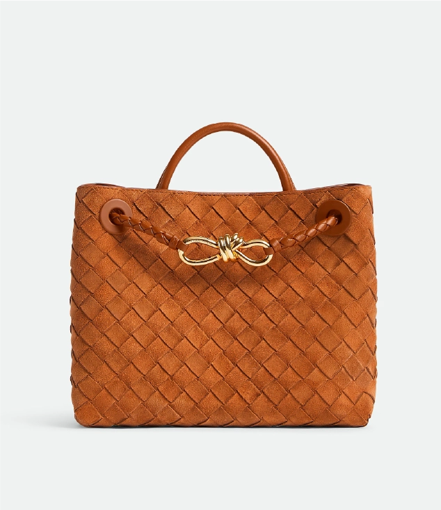 アイコニックなノットディテールをあしらったイントレチャートスエードのトップハンドルバッグ。スライド式クロスボディストラップが付いています。