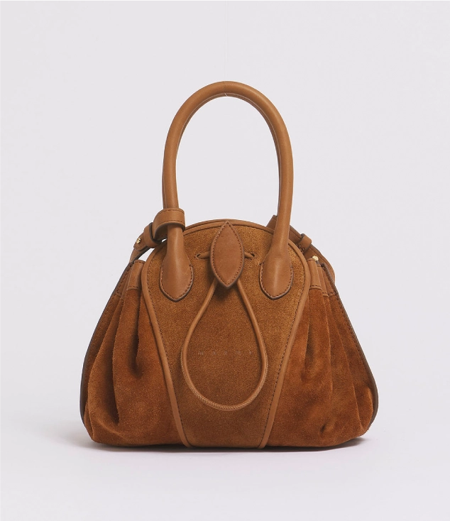 博愛が花言葉のチューリップから着想を得た“TULIPEA”スモールバッグ。チューリップのつぼみがそっと花開く瞬間を思わせるシルエットが特徴的。スエードとグレインレザーの2種類のレザーを使用。開口部はドローストリング仕様、取り外し可能なショルダーストラップが付いています。