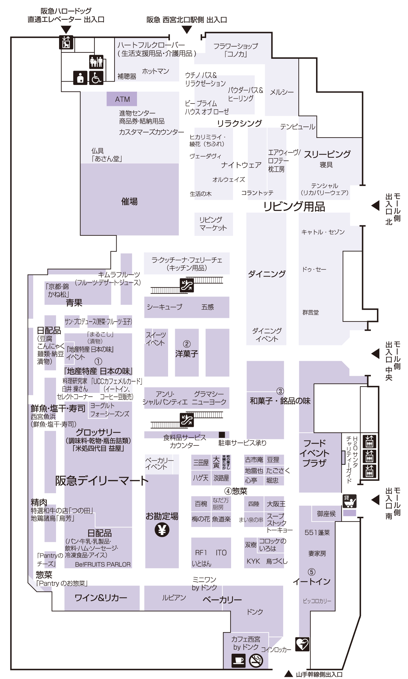 - イートイン 豚まん・中華「551蓬莱」、韓国家庭料理「妻家房」、カレー「ピッコロカリー」、喫茶「カフェ西宮 by ドンク」