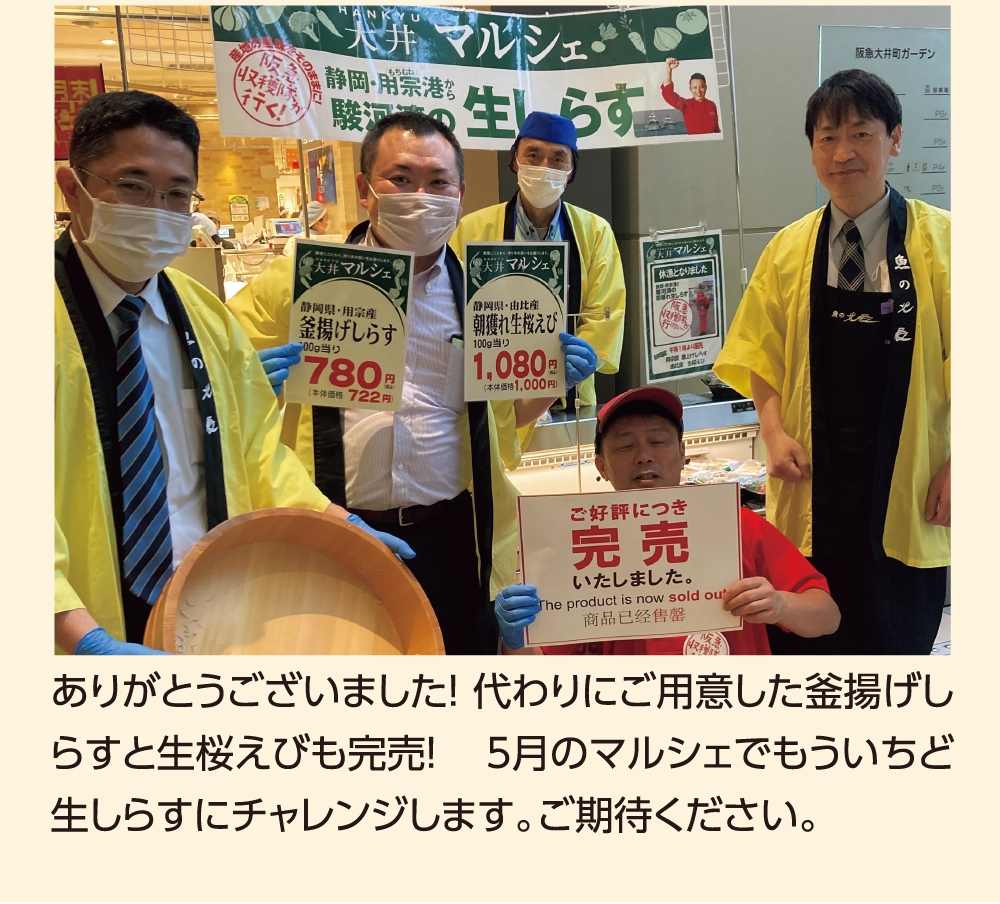ありがとうございました! 代わりにご用意した釜揚げしらすと生桜えびも完売! 5月のマルシェでもういちど生しらすにチャレンジします。ご期待ください。